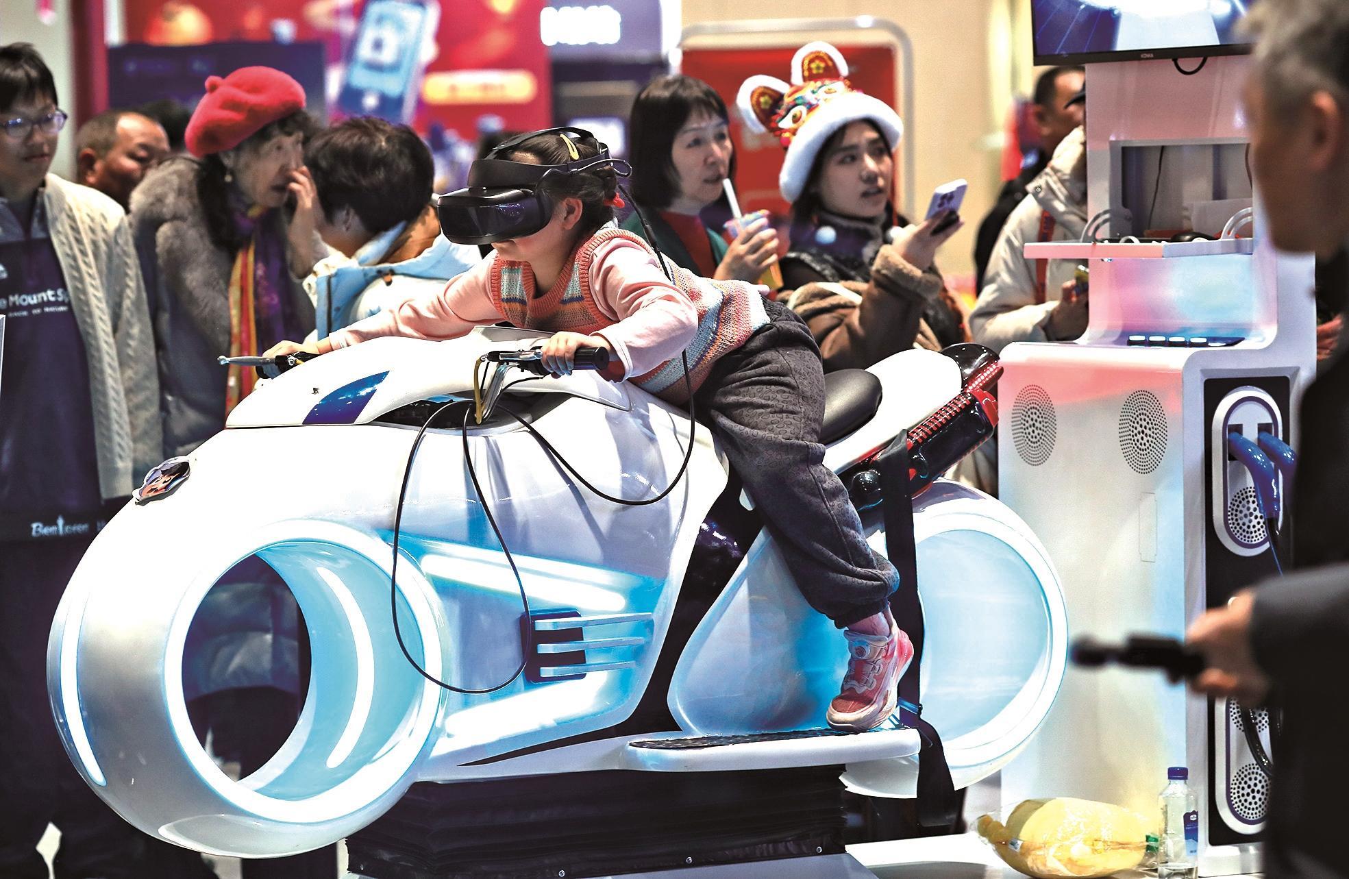 视觉中国供图从央视马年春晚到各地新春庙会,一个个新春庙会,浙江金华,正在浙江金华,沉浸式体验VR摩托车。正在四川宜宾,